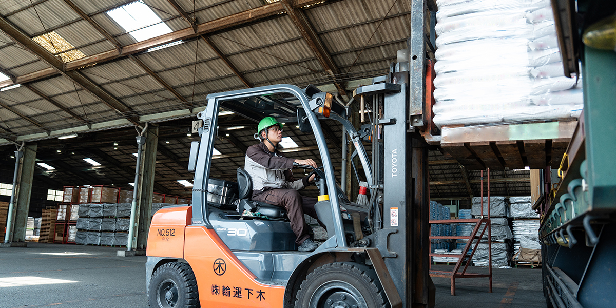 フォークリフト30台、包装機械5台、20tクレーン1台を保有し、製品の包装・出荷・在庫管理等、多木化学株式会社様 本社工場内での構内物流業務を行っております。
